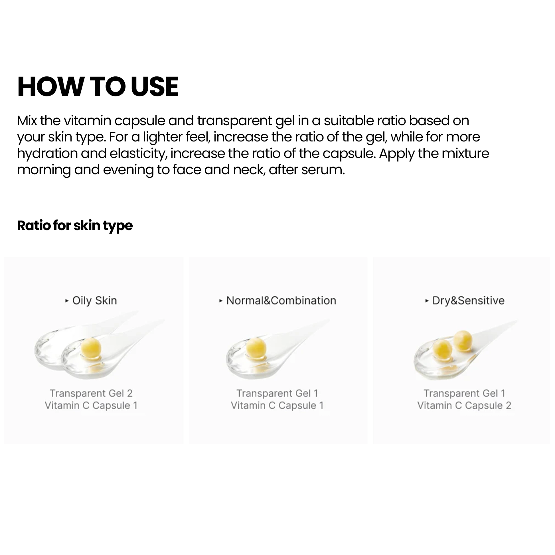 The transparent gel component is infused with ferulic acid, vitamin E, Q, and P, providing hydration and glow with minimal irritation. Its light texture allows you to customize the capsule-to-gel ratio according to your skin type, ensuring a stable, soothing blend that absorbs easily into the skin for everyday use.